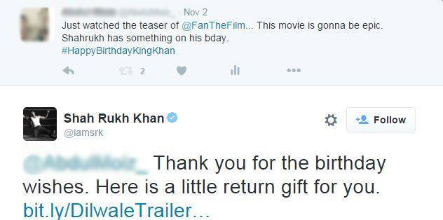 LAHORE: (Web Desk) – Bollywood star Shahrukh Khan on Monday went on a tweeting spree, replying to every single tweet mentioning him, with a thanking message for wishing him on his birthday and a link to his upcoming movie ‘Dilwale’ trailer’s link. The movie is going to release on December 18, 2015 and stars one of the most successful pairs in Indian film history i.e. Shahrukh Khan and Kajol after 5 years, reported Dunya News.