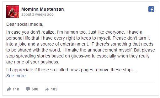 LAHORE (Web Desk) – In a Snapchat post on Tuesday, singer Momina Mustehsan has apparently confirmed her break-up with Ali Naqvi whom she was engaged to last year in September.