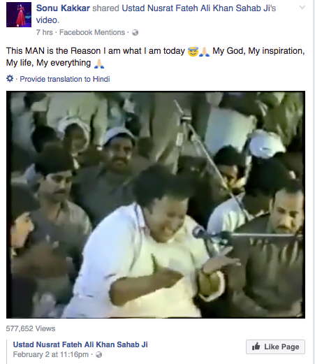 Summary The Indian singer says Nusrat Fateh Ali Khan is her inspiration, 'My life, My everything'