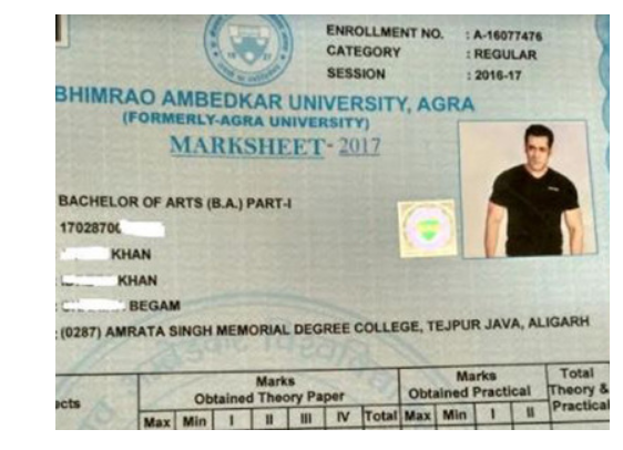 AGRA (Daily Dunya/Web Desk) - In a bizarre incident depicting negligence in the education system, Bhimrao Ambedkar University in Agra published a marksheet of Bachelor of Arts student with Bollywood actor Salman Khan’s picture.