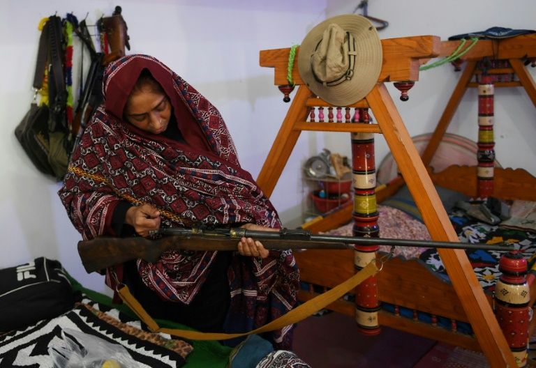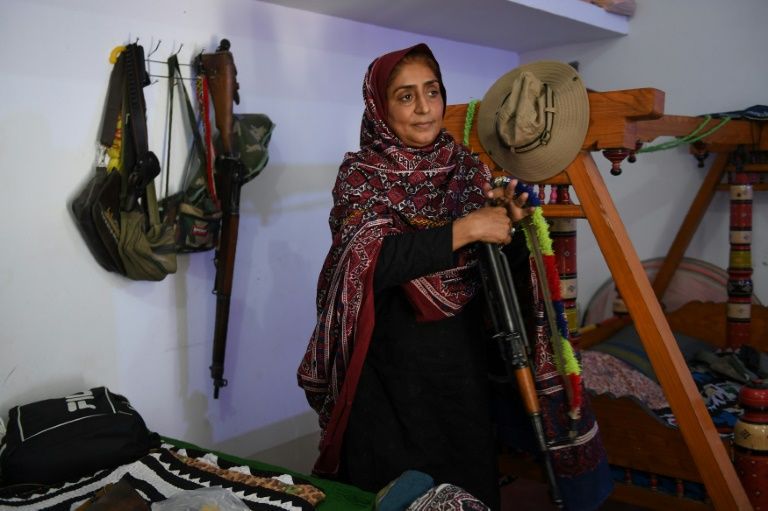Pakistani woman Mukhtiar Naz, known as Waderi Nazo Dharejo, holds a gun at her ancestral home in Qazi Ahmed in Sindh province. Photo: AFP
