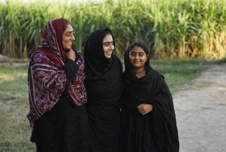 Pakistani woman Mukhtiar Naz (L), known as Waderi Nazo Dharejo, with her daughters at her agriculture field in Qazi Ahmed in Sindh province. Photo: AFP