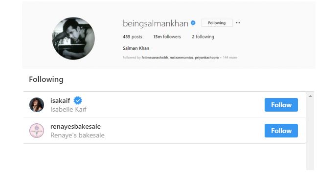 (Web Desk) – Bollywood superstar Salman Khan only follows two accounts on Instagram. Startlingly, Salman Khan does not follow Katrina Kaif but includes her sister Isabelle on the list of two lucky accounts.