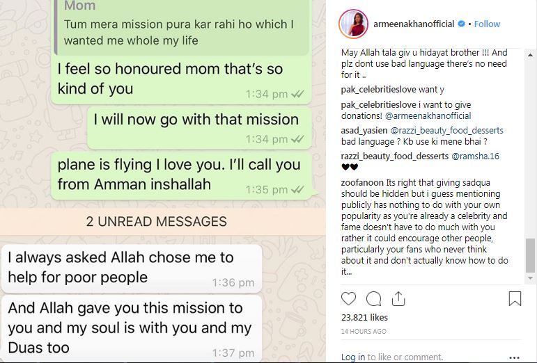 "I wanted to share something with you guys. My mother told me a long time ago that whatever you do in life, always maintain your humanity and don’t forget that God does not like arrogance, such were the lessons taught to me when I was little. I started this Syrian journey with my moms prayers. It is HER dream that I am living right now and her wish that I am fulfilling. It is such a sweet thing and I wanted to share her messages. My heart swells when I read these. This is why I think mothers are so sacred and a lot of these Syrian kids have lost theirs. This is where you come in, you guys are amazing human beings, you’ve helped me put a smile on these children’s faces even if it is for a bit. I am amazed at the love, support and the donations pouring in, I am grateful FROM the heart Thank you so much. I begin day two with my mother in my thoughts," Armeena revealed on Instagram.