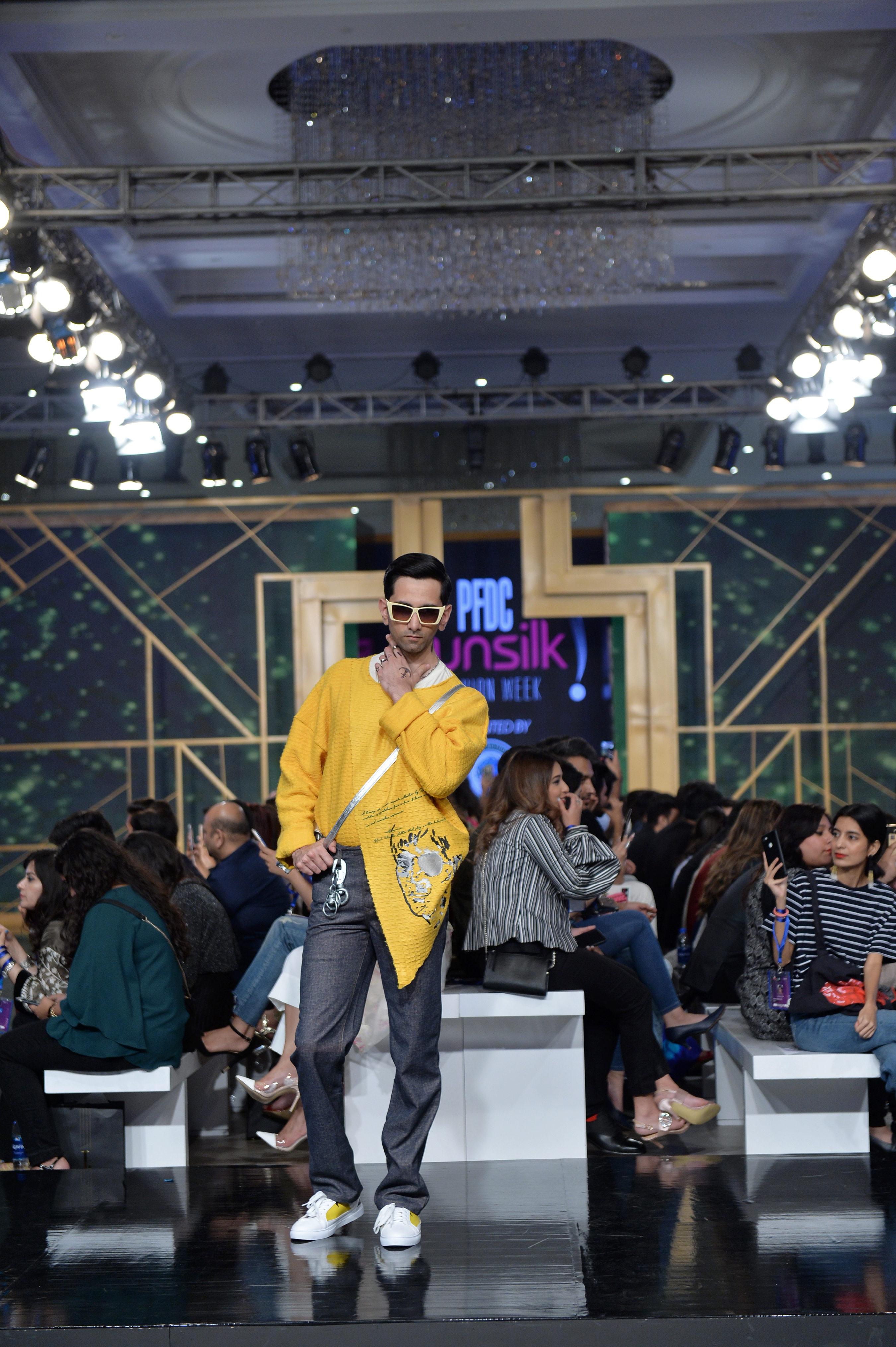 A luxury street-wear capsule collection by Republic by Omar Farooq explored the evolution of symbolism from a form of basic communication, to that of self-representation and anarchic expression. Much like the clothes that played on the balance between past construction and present deconstruction on a palette of subtle creams just positioned with fluorescent neon shades, challenged the contrasting idea of how the same symbol can be both favorable for one culture and baneful for another. Neon shirts, vests and stripes on single toned suits added a pop of color to sophisticated menswear sprucing up the runway looks. Sheheryar Munawar was the showstopper.