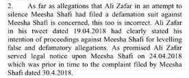 The statement also read, Ali Zafar served Meesha with the legal notice on 24-04-2018 well before her complaint dated 30-04-2018.