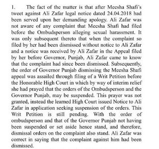 According to the statement, a legal notice was sent to Meesha Shafi demanding apology after her tweet on 24-04-2018. Ali Zafar was not aware of Meesha’s complaint before the Ombudsperson, which he came to know of after its dismissal.