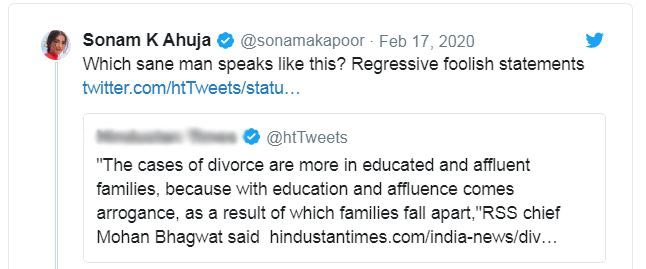 MUMBAI (Dunya News) – Bollywood actress Sonam Kapoor has called the statement of Rashtriya Swayamsevak Sangh (RSS) chief Mohan Bhagwa regarding divorce as ‘regressive foolish’.