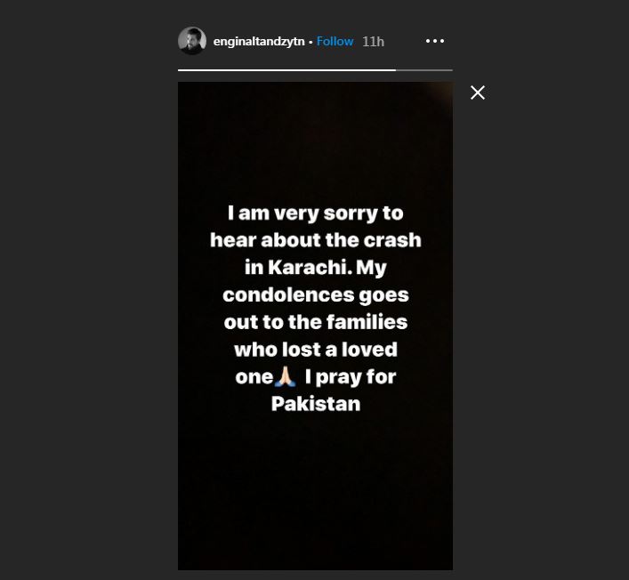 Offering condolences to the families of the victims of the plane crash, Engin Altan said in his Instagram story, “I am sorry to hear about plane crash in Karachi. My condolences go out to the families who lost a loved one. I pray for Pakistan.”
