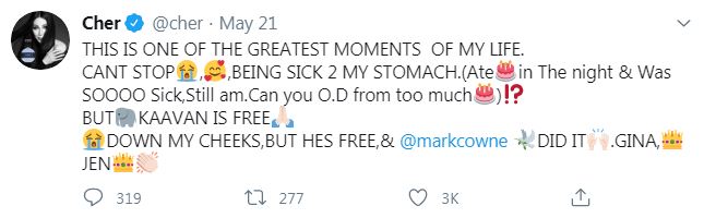 The US singer took to social-networking website and wrote, “We have just heard from Pakistan High Court that Kaavan is free,” adding a string of emojis and saying she felt sick. “THIS IS ONE OF THE GREATEST MOMENTS OF MY LIFE,” the singer continued.