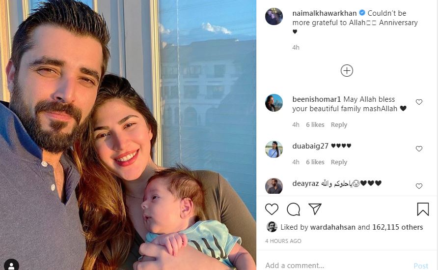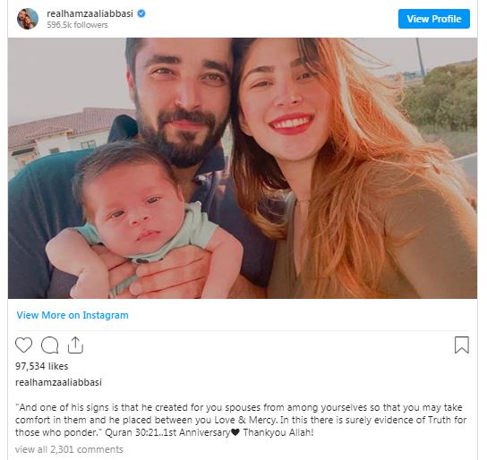 (Dunya News) – The cute and adorable pictures of Pakistani actors Hamza Ali Abbasi and Naimal Khawar with their newborn son Muhammad Mustafa Abbasi on the occasion of their first wedding anniversary have taken the social media by storm.