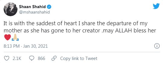Shaan announced the news of her demise in a tweet on Saturday. The senior actor wrote, "It is with the saddest of heart I share the departure of my mother as she has gone to her Creator. May Allah bless her.”