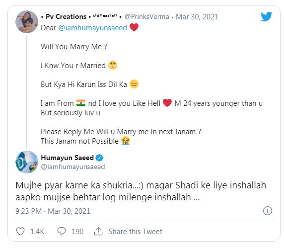 In his reply, Humayun Saeed thanked the fan for loving him but added that, “InshAllah you will find better people to marry than me”.