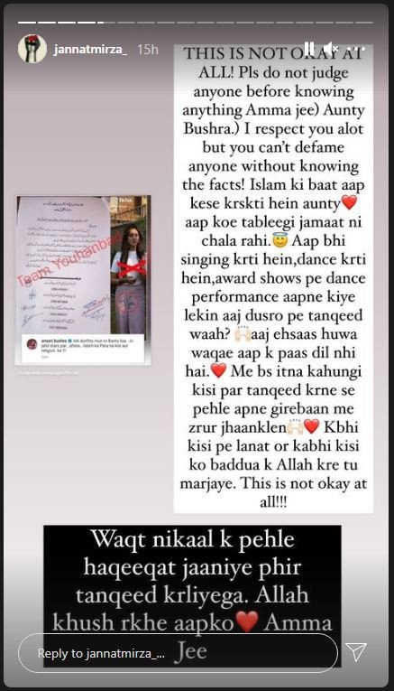 Jannat Mirza, in a response, asked Bushra Ansari not to judge without knowing. “This is not okay at all! Please do not judge anyone without knowing anything Amma Jee. I respect you a lot but you can’t defame anyone without knowing the facts. Islam ki baat ap kese karsakti hain aunty, ap koi tableeghi jamaat nahi chala rahin (besides, how can you preach Islam when it’s evident you’re not running a transnational Islamic movement yourself),” she added.