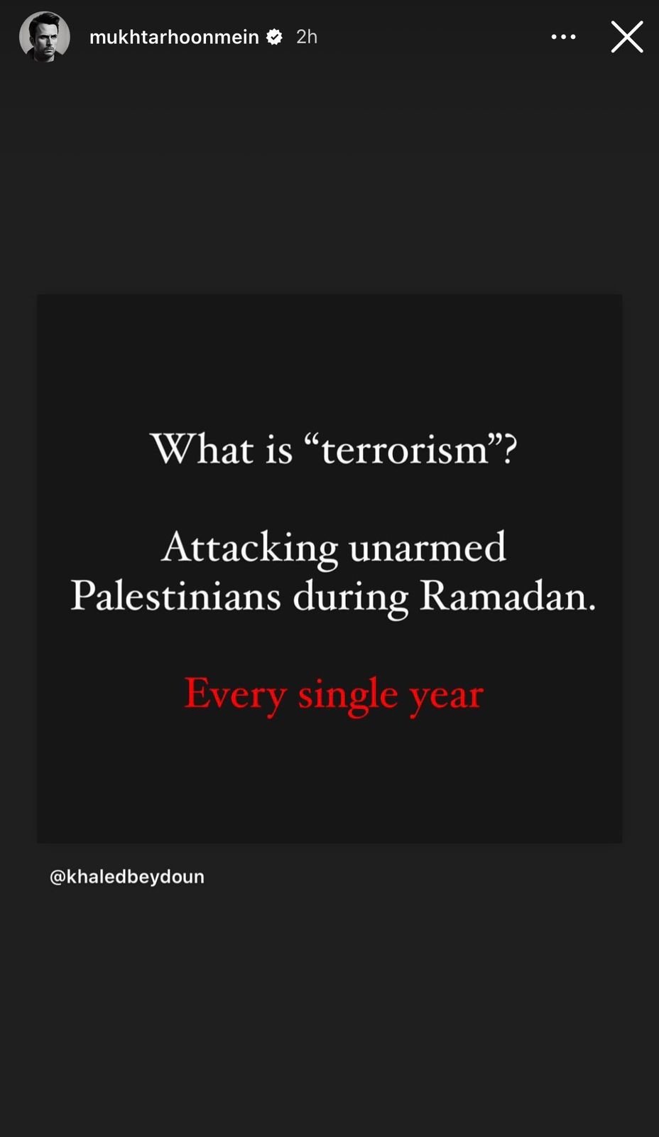 Usman Mukhtar was seen sharing a feed post doing the rounds that stated, "What is terrorism? Attacking unarmed Palestinians during Ramadan. Every single year."