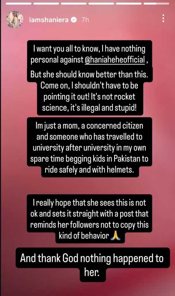 Social activist Shaniera Akram took to Instagram to express her concern. Known for her longstanding advocacy for road safety, Shaniera criticised the video and stressed the responsibility that comes with influence.
