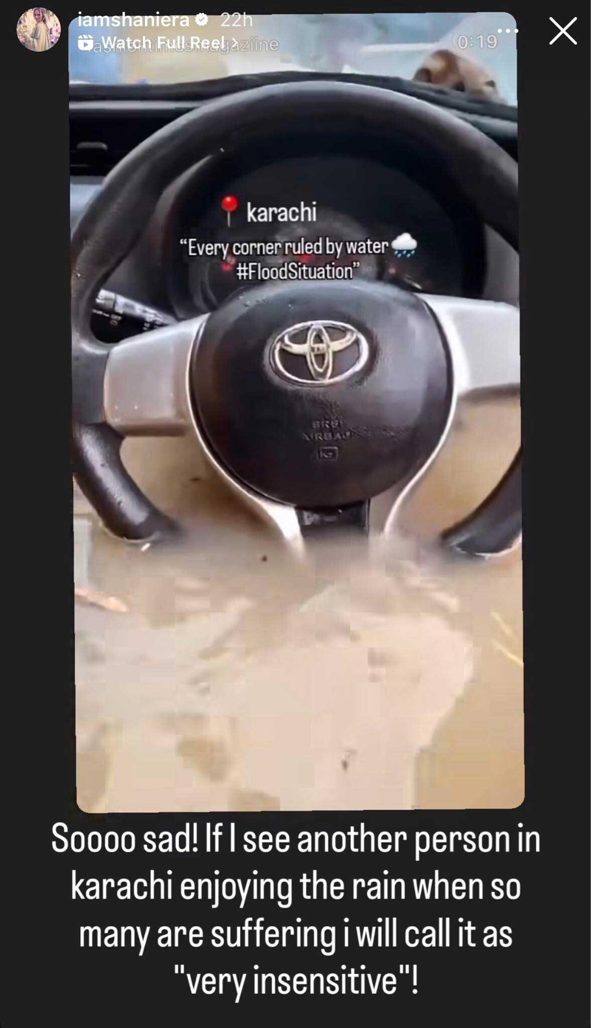 In response, activist Shaniera Akram took to her Instagram stories, sharing videos of people stuck in waist-high water inside their cars. Saddened and frustrated, she wrote: “Soooo sad! If I see another person in Karachi enjoying the rain when so many are suffering, I will call it ‘very insensitive’!”