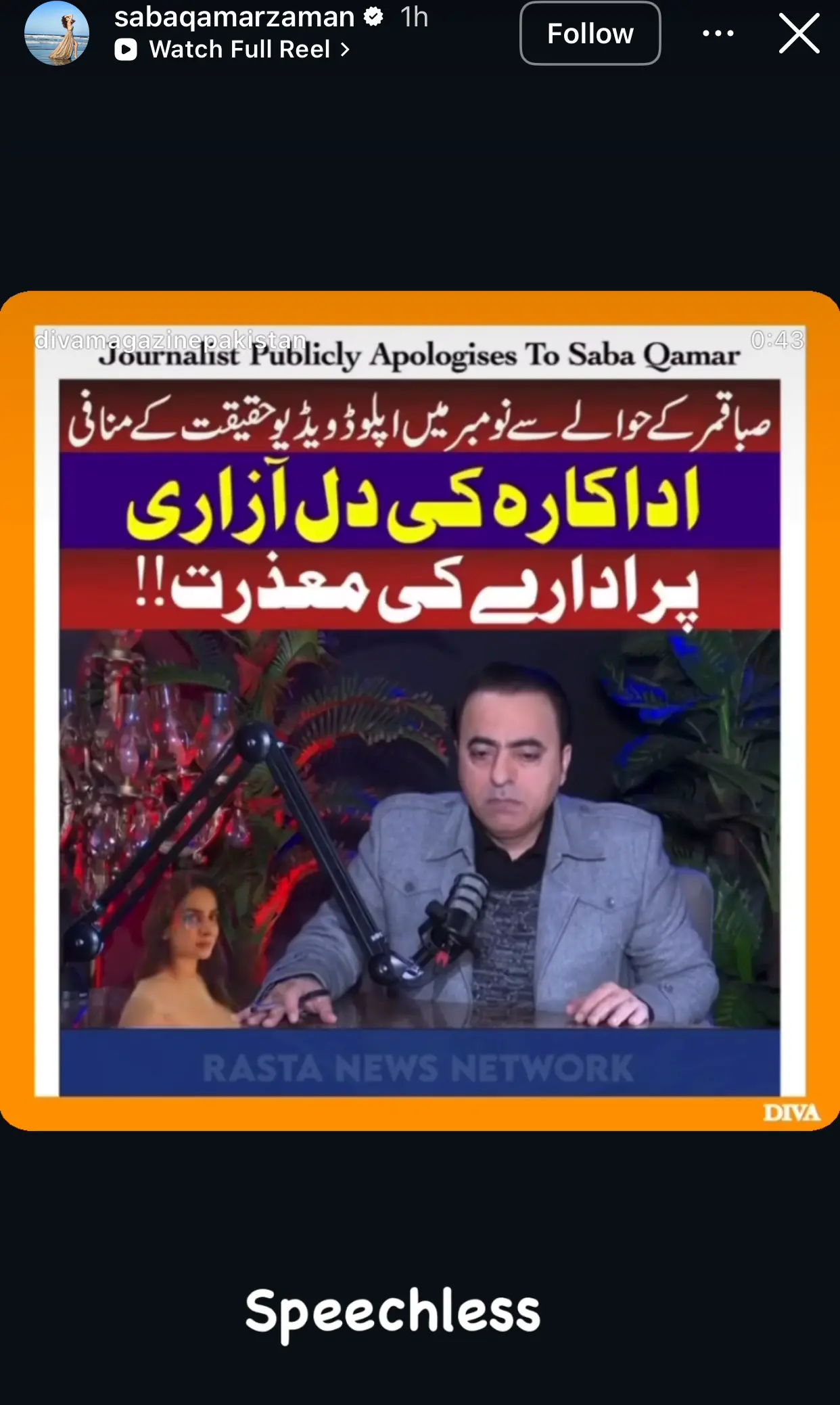Reacting swiftly to the apology, Saba Qamar shared a clip from the podcast on her Instagram story and wrote a single word, “speechless,” reflecting her emotions over the entire episode.