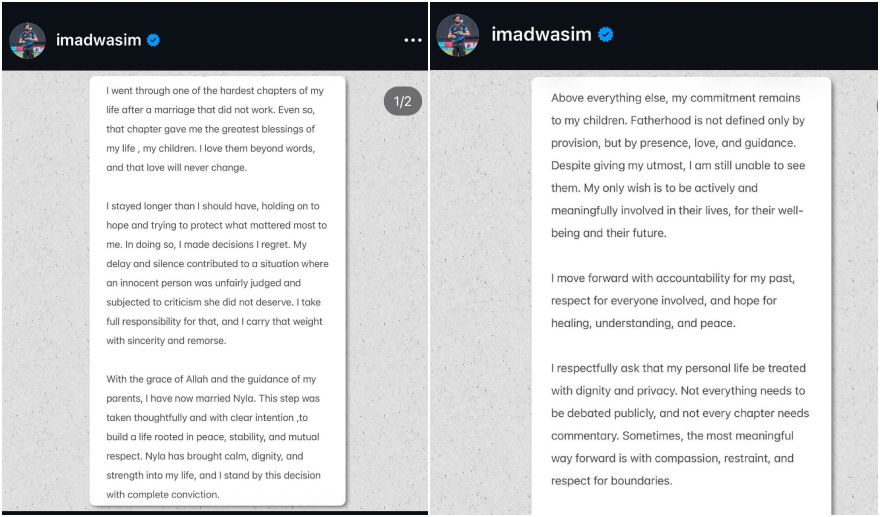Imad Wasim said the marriage officially ended in late December 2025 after years of unresolved conflict. He also addressed the public criticism directed at his former wife, stating that he accepts responsibility for aspects that led to public backlash against her. He asked supporters and media to show compassion and allow both families space.