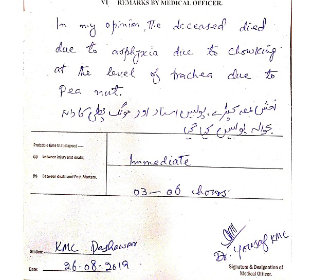 Under the section "remarks by a medical office", the post mortem document states: "In my opinion, the deceased died due to asphyxia due to choaking at the level of trachea due to peanut."