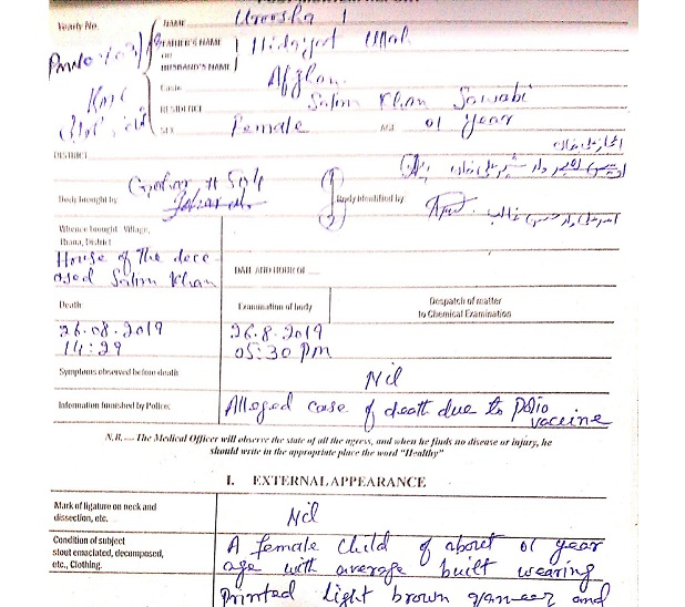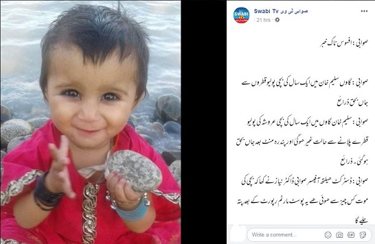 “Swabi in Salim Khan village, a one-year-old baby girl Uroosha’s condition deteriorated after she was administered polio (vaccine) drops and she died after 15 minutes. Sources.”
