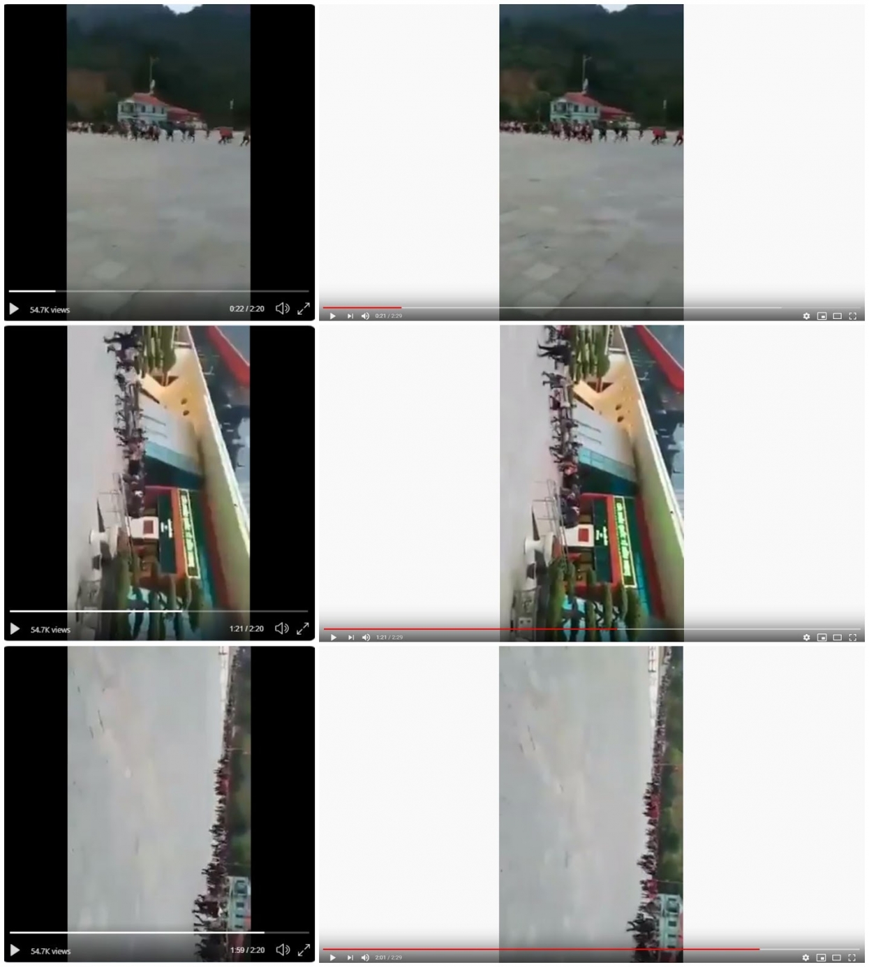 Below are three screenshot comparisons from the misleading footage (L) and the 2019 YouTube video (R):