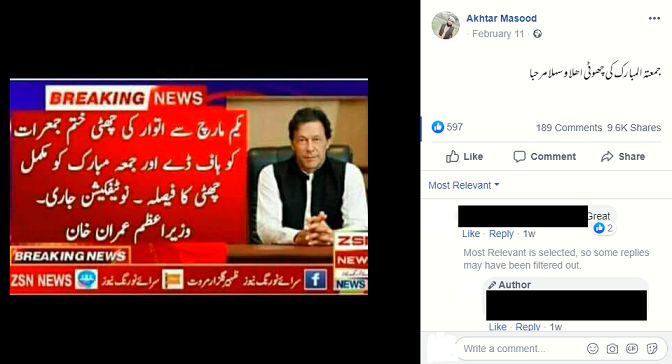 ISLAMABAD (AFP) – An image of Pakistan’s Prime Minister Imran Khan has been shared thousands of times in multiple Facebook posts which claim the Pakistani government plans to change the country’s weekly holiday from Sunday to Friday starting from March 1, 2020.