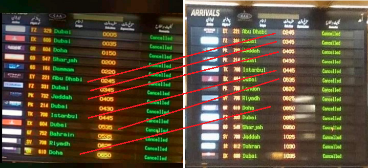 Below is a comparison of the photo from the misleading post (L) and the March 2019 photo (R) with corresponding cancelled flights noted in red: