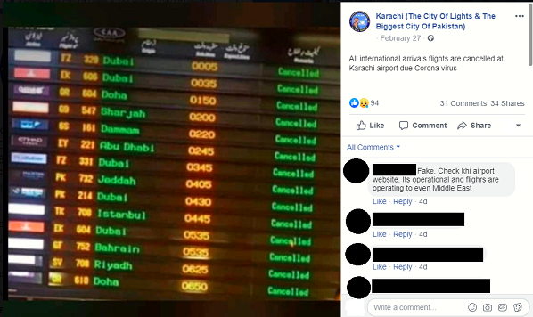 KARACHI (AFP) – An image of a terminal display screen showing a list of flights cancelled at an airport in the Pakistani city of Karachi has been shared repeatedly on Facebook, Twitter and WhatsApp alongside a claim that all international arrivals were halted in February 2020 during the novel coronavirus epidemic. The claim is false; Pakistan’s Civil Aviation Authority confirmed that international arrivals were not cancelled in February 2020. The photo in the misleading posts corresponds with another image from the airport which has circulated in reports about flights being suspended at the airport in March 2019.