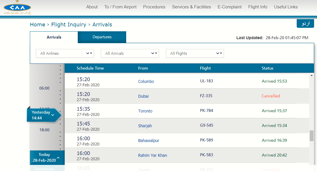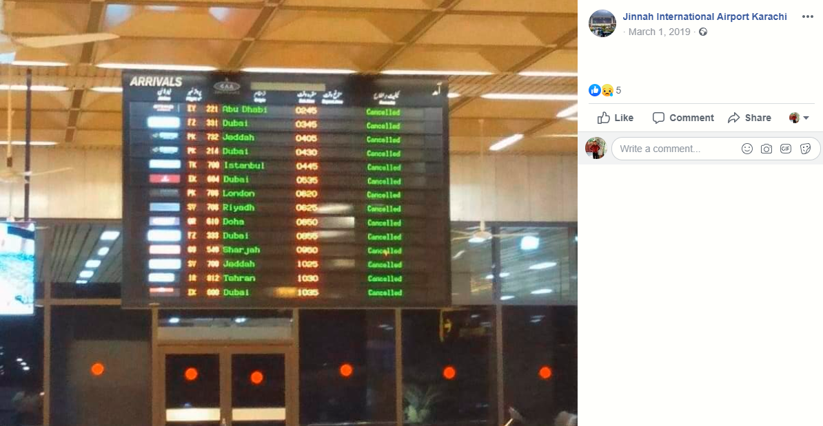 Pakistan’s Civil Aviation Authority reported that international flights generally arrived without interruption at Jinnah International Airport on February 27, 2020 in the afternoon, the time that the first misleading Facebook post was published.