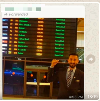 An uncropped version of the photo, which includes a man standing in front of the flight information display, also circulated on WhatsApp in Pakistan with a similar claim.