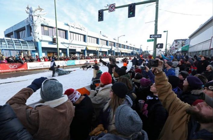 Downtown Anchorage was temporarily converted into a noisy dog lot, with trucked-in snow covering the streets. Bundled-up spectators – including dignitaries such as Governor Mike Dunleavy and U.S. Senator Lisa Murkowski – gathered to cheer, snap photos and get autographs from the dog drivers headed out on the annual 1,000-mile (1,609-km) trek to Nome.