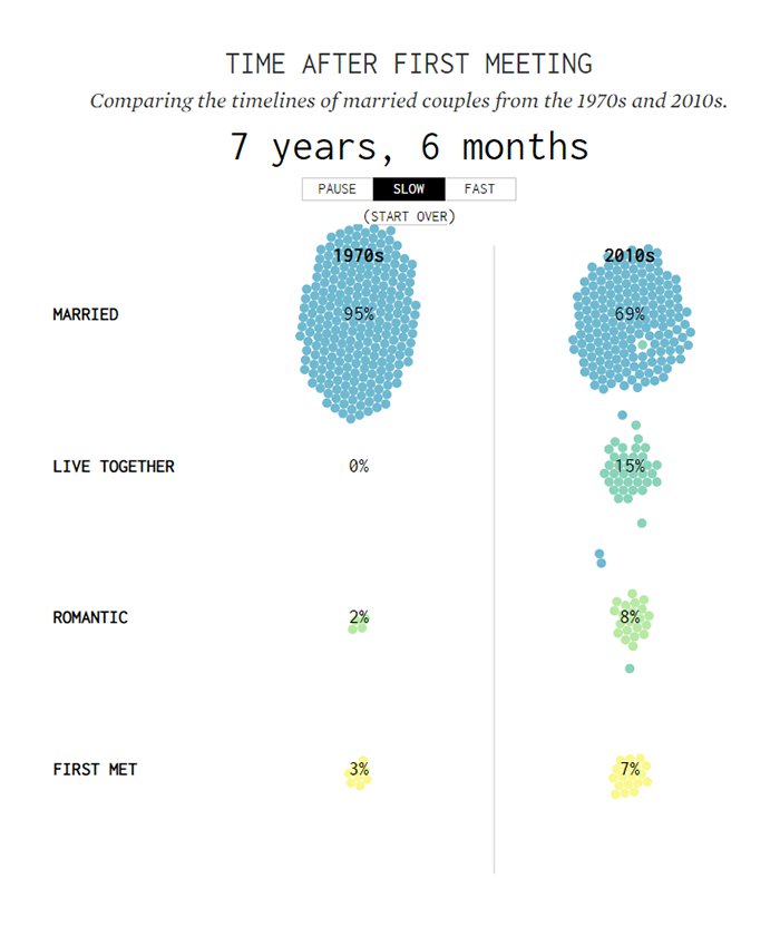 At the 10-year stage, 96 percent of 1970s couples have decided to tie the knot, compared with 76 percent of 2010s couples. In terms of this animation, the dots (or couples) are taking longer to flow upwards.
