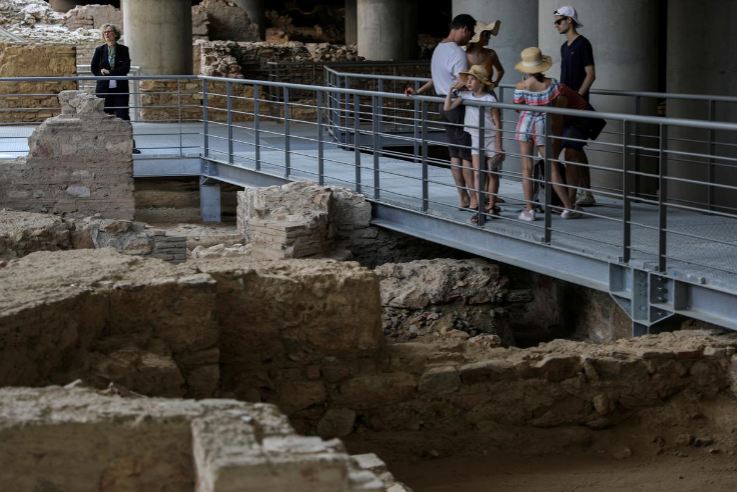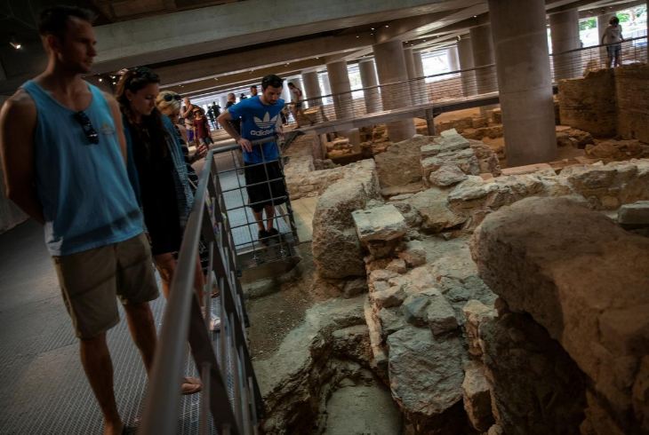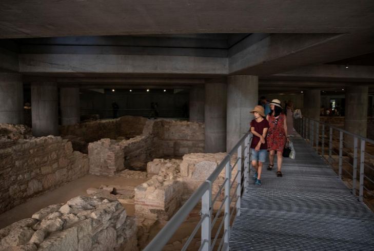 People visit the newly opened archaeological site underneath the Acropolis Museum in Athens, Greece