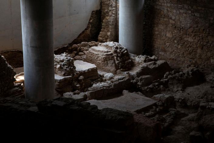 Below the museum’s base which floats on concrete pillars, lies a neighbourhood of excavated homes, workshops, baths, streets and drainage trenches, uncovered during works to build the museum.