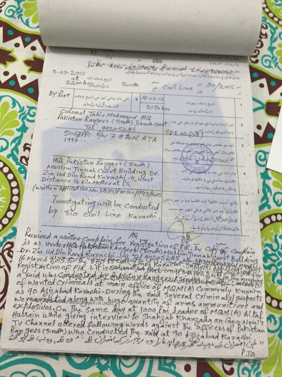 MQM leaders Muhammad Hussain, Muhammad Kamran and other workers had visited Civil Lines Police Station to get the copy of the FIR but were unable to get it, Dunya NEws reported.