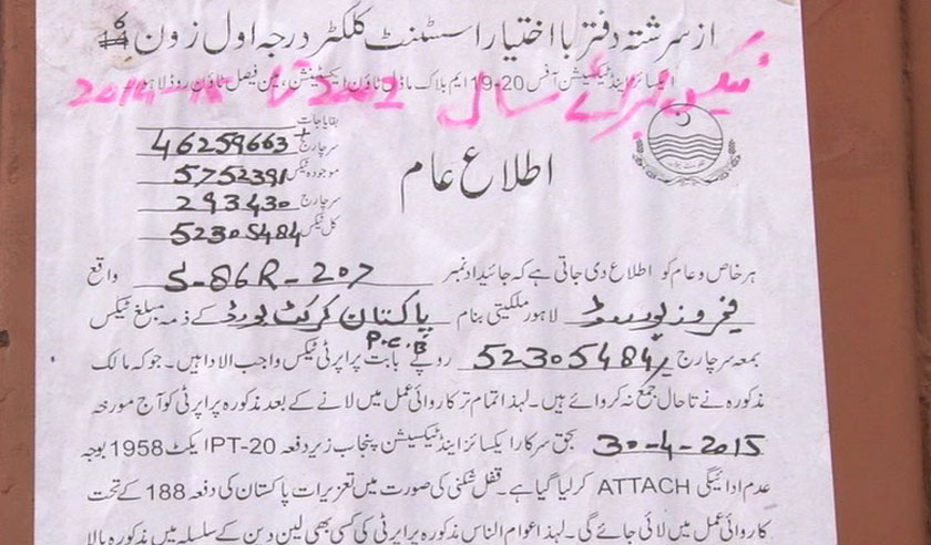 Excise and Taxation Department placed a notice at the main gate of Qaddafi Stadium