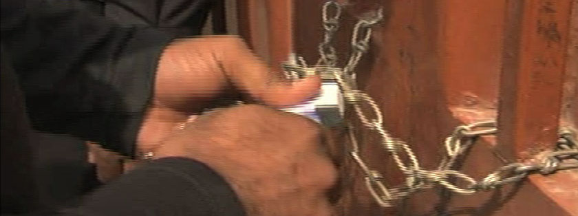 A policeman unsealing the main gate of Qaddafi Stadium which also houses PCB offices
