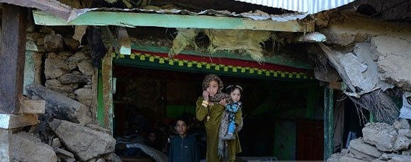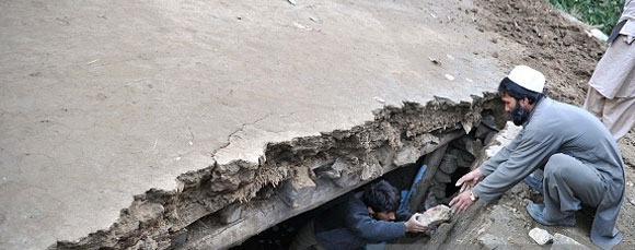 Men remove debris from their damaged house following an earthquake in Upper Dir (AFP Photo)