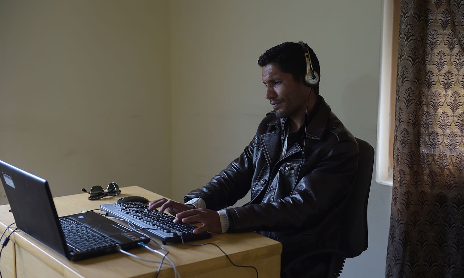 He downloads audio files sent from the US: English-language recordings of patients diagnoses sent from Tennessee, which he transcribes before sending back, acting as a long-distance secretary.
