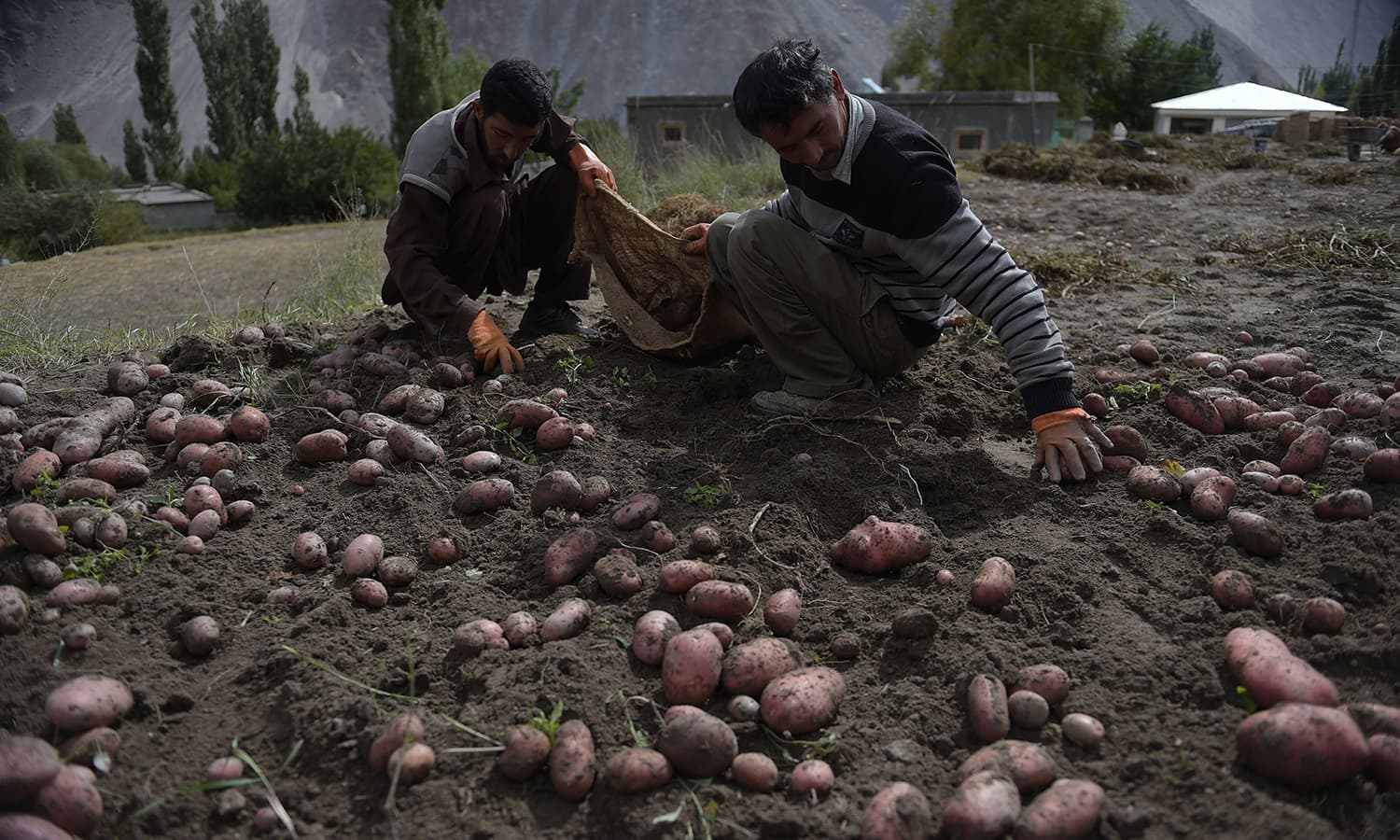 Farmers harvesting potatoes in a field next to an e-facility center (back) in the village of Gulmit