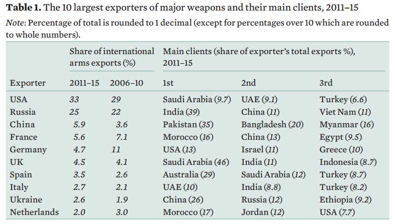 The country still accounted for only 5.9 percent of global arms exports from 2011-2015, well beind the United States and Russia, by far the world’s two largest arms exporters.
