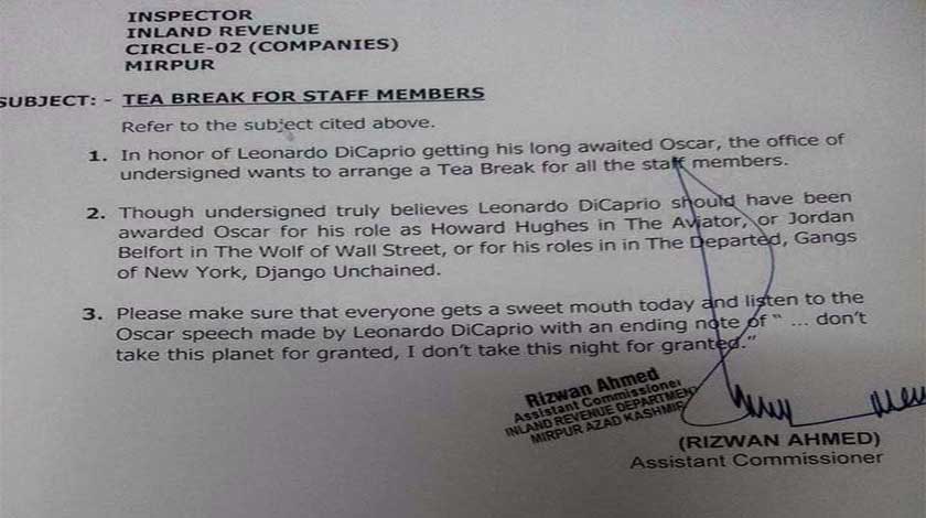 MUZAFFARABAD (AFP) - A Pakistani civil servant who never let go of hope Leonardo DiCaprio might win an Oscar became a social media star after his memo ordering a tea break for staff celebrating the actor’s long-awaited victory went viral.