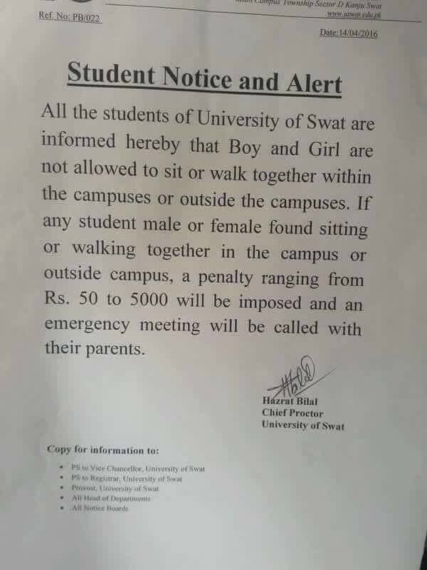 “All the students of University of Swat are informed hereby that Boys and Girls are not allowed to sit or walk together within the campuses or outside the campuses,” the notification states