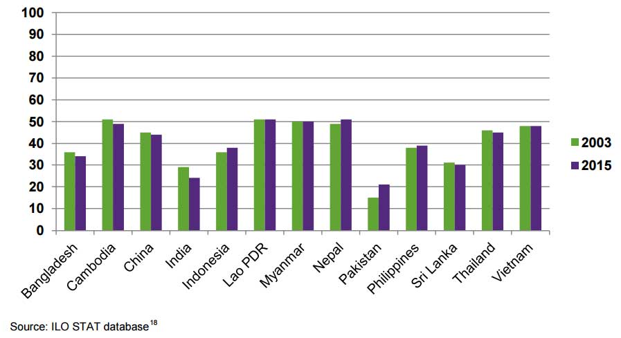 Women‘s share in total employment across the Asia region (selected countries), 2003 and 2015, percentages, ILO estimations