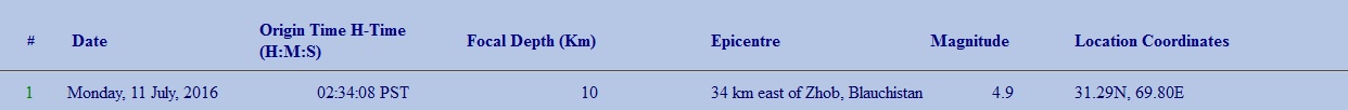 According to National Seismic Monitoring Centre, the epicenter of the quake which struck at 02:34am on early Monday morning was located 34 km east of Zhob, Blauchistan at the depth of 10 kilometre.