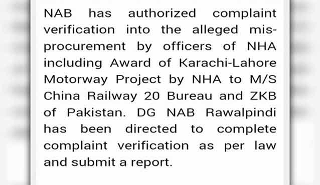 ISLAMABAD (Dunya News) – National Accountability Bureau (NAB) on Thursday took notice of alleged Karachi-Lahore Motorway corruption scandal regarding construction contract highlighted by Transparency International, reported Dunya News.