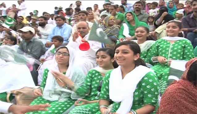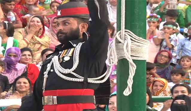 LAHORE (Dunya News) – Hundreds attended the flag-lowering ceremony at Wagah border on the occasion of the country’s 70th Independence Day on Sunday. The attendants witnessed the Rangers’ parade and raised enthusiastic slogans showing their love for the country, reported Dunya News.