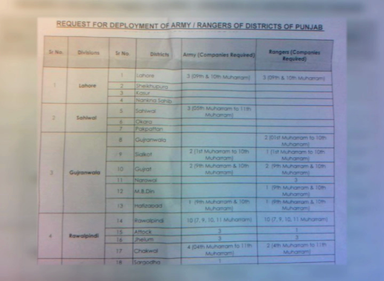 LAHORE (Dunya News) – Deployment of contingents of Rangers and Pakistan Army has been approved for security of key installations, business points, markets and processions during Muharram.