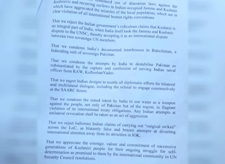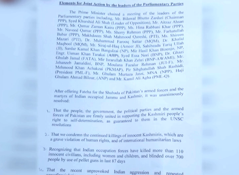 The parties acknowledged that in the last 87 days, over 700 Kashmiris lost their eyesight and 110 innocent civilians were martyred included women and children due to Indian atrocities in held Kashmir valley.